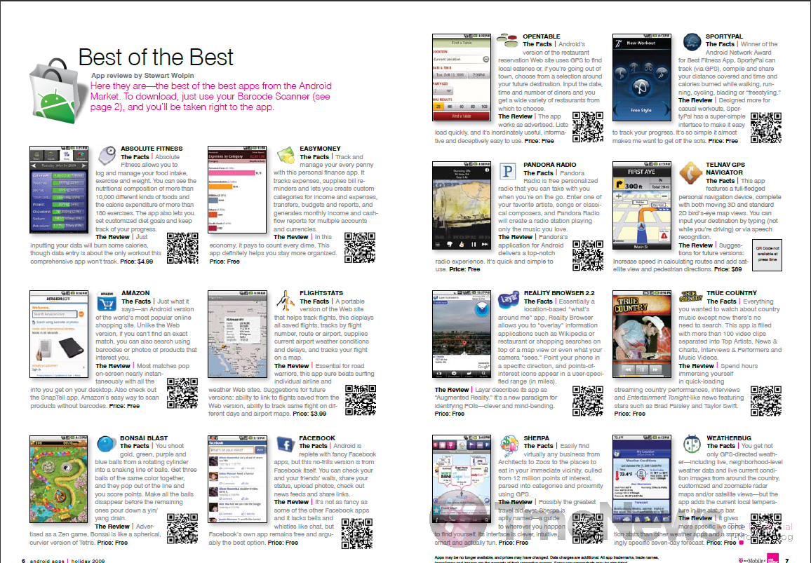 There is little question as to whether or not T-Mobile has gone all in with the Android platform as they offer double the number of devices as the closest competitor. Well as it’s that time of year to spend the money you receive from returning that ugly sweater Grandma gave you, T-Mobile is looking to showcase the Android Market with a Gift Guide for the Holidays. Our source indicates this brochure is given away with all Android purchases, save for the MyTouch, which has us scratching our head. Hit the jump for a gallery of Android apps and hopefully some recommendations for new downloads to spend that holiday money on!