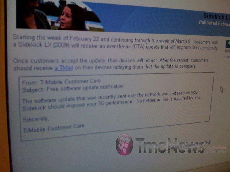 Sidekick owners haven’t received much love lately, especially since there have been rumors of the myTouch Slide taking its place in Magenta’s heart. According to T-Mobile, a new Sidekick LX (2009) OTA (Over-the-air) Update is rolling out starting today and will gradually make its way to the masses by March 8th. The OTA is expected to improve 3G connectivity. Once Sidekick LX (2009) owners accept the update, their devices will reboot so don’t freak out when that happens. After the reboot, LX 2009 owners will receive a TMail on their Sidekick handsets with the details of the update.