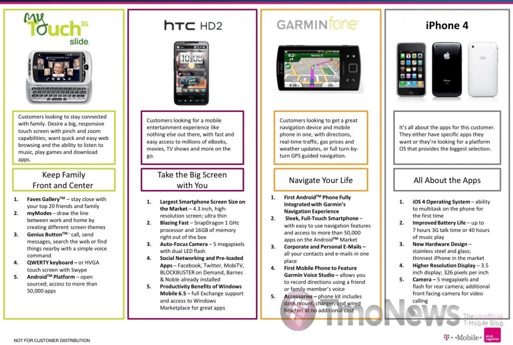 It’s not uncommon for carriers to release a bullet point comparison sheet when a competitor is about to drop a major device onto the scene. Considering it doesn’t get any bigger than iPhone 4, the fact that T-Mobile has a comparison chart available for its employees is hardly news. We think its well beyond safe to say that Sprint and Verizon have either posted their own or will do so in the coming days. What’s interesting about this picture and please don’t think we’re reading any more into it than what can be taken at face value is that it really doesn’t highlight the strengths of other devices over the iPhone’s. To be sure, the myTouch Slide, HTC HD2 and Garminfone all have their highlights, strengths and weaknesses when compared to each other, never mind the iPhone. So this is less of a comparison chart and more of an “I have no idea what the intended goal here is.” Not to mention, does anyone realize that for the iPhone 4, pictured is the 3GS?