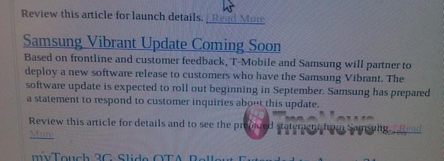 T-Mobile released a short internal statement (Check out Engadgetmobile for the same story, different pic) to the front lines acknowledging that a fix to the Samsung Vibrant GPS issue was indeed forthcoming sometime in September. This isn’t really news however as Samsung already said as much being significantly more proactive than they were with the Behold 2. Still, it’s nice to see that T-Mobile is being proactive as well disseminating this info and allowing the front line folks who ultimately deal with customer feedback/trouble to know that something is on its way to rectify the problem. I can only wish they would do the same thing with Motorola and the Cliq/Cliq XT Android updates.