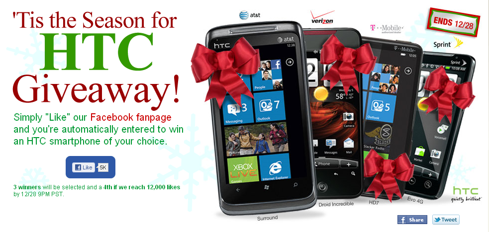 As the Holiday season approaches, our awesome friends over at Letstalk.com are running an HTC phone giveaway to celebrate for the holidays. The giveaway includes T-Mobile’s first Windows Phone 7 handset, the T-Mobile HTC HD7 (retail value $499.99), the HTC Surround from AT&T, the Verizon Droid Incredible, and the HTC Evo 4G from Sprint. To enter the giveaway for a chance to win, simply “like” Letstalk’s FaceBook fan page at http://facebook.com/letstalk and you’re done! 3 winners will be selected on December 28th at 9PM PST (4 winners if they reach 12,000 likes). Be sure to check out the video below for all the details!
