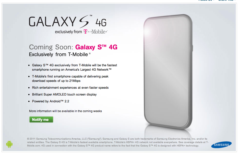 If you are a frequent visitor to this site you know that these notification pages pop up for almost every anticipated new device. It’s nice to see T-Mobile being proactive in attempting to provide you with updates regarding the launch of this phone. Of course, we’re pretty confident we’ve already hit the nail on the head for a February 23rd launch with this device and since we have specs and pics checked off, the only things left are price and name. Honestly, is this the Galaxy S 4G or the Vibrant 4G, or maybe it’s the Vibrant Plus?