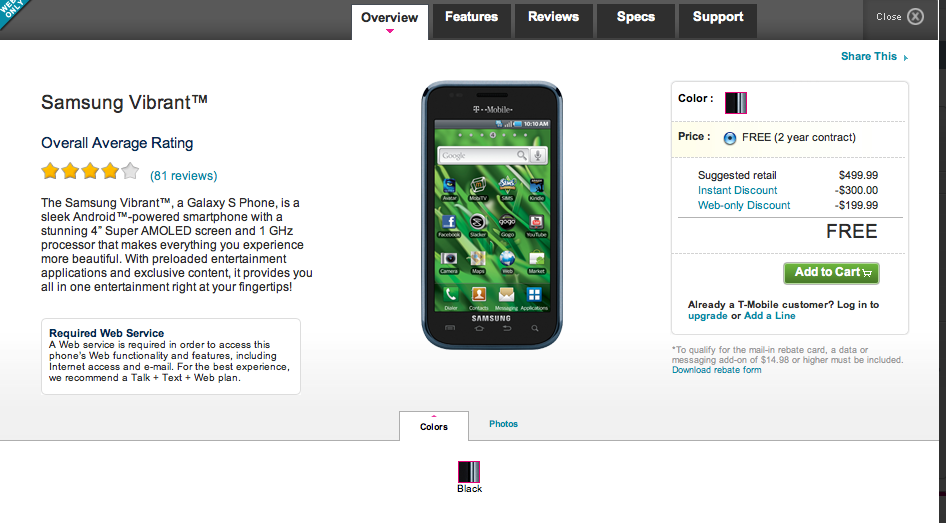 If you’ve been eyeing that Samsung Vibrant from across the room but haven’t yet worked up the nerve to ask her to dance, now is the time. T-Mobile.com currently has the Vibrant available for zero dollars, that’s right zero dollars. While the Vibrant waits patiently for its chance to beef up to Android 2.2, this is a great opportunity to pick up this device if you’ve been watching her from afar. You better act fast as you never know when someone else might steal your chance.