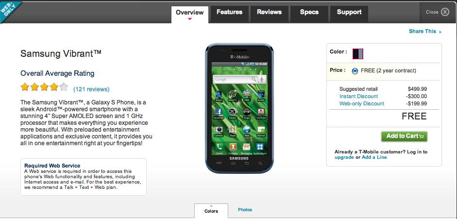 If there was ever a time to push the Samsung Vibrant, now would be that time! Given that, T-Mobile.com currently has the Samsung Vibrant on sale for the low low price of free!