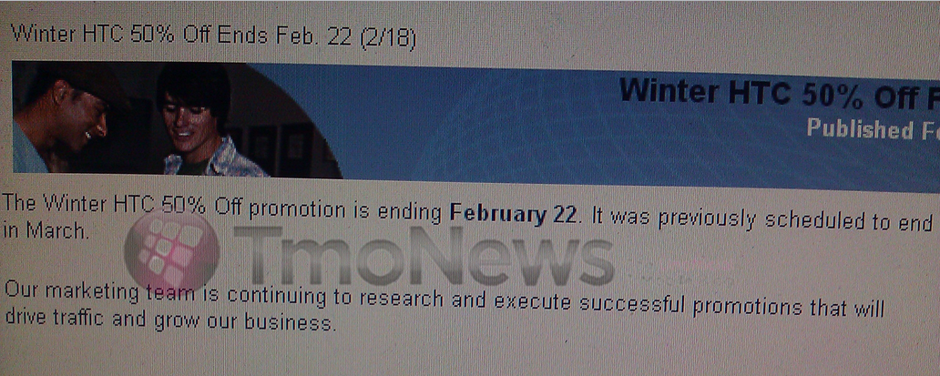 Remember the 50% off HTC promotion T-Mobile was running back in January? Well, it looks like T-Mobile is ending the promotion a little earlier than expected. We reported in mid-January that Magenta would be running a promotion in which qualified customers with an eligible 2-year upgrade, would receive 50% off their HTC smartphone purchase when they opted for the Unlimited Web plan. The promotion went into affect on January 19th and was supposed to end March 8th, but now, it will end on February 22nd.