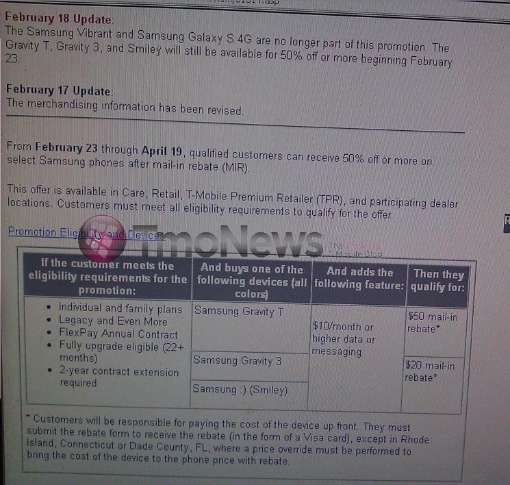 Update: We’ve just received word that the Samsung Vibrant and Samsung Galaxy S 4G are no longer a part of this promotion! Once more we are asking around for more info and will further update the post as it arrives!