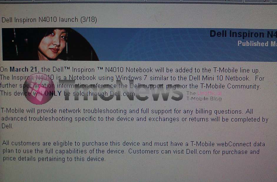 As mentioned back in early February the anticipated price for the Core i3, 2 GB Ram and 250 GB hard drive would be $399.99. The Dell Inspiron N4010 wilt take advantage of T-Mobile’s newest webConnect offerings and will ONLY be sold through Dell.com.