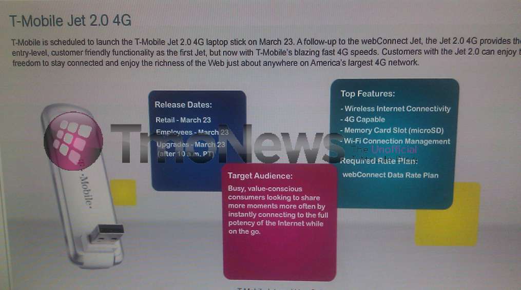As expected, the next iteration of the T-Mobile Jet, version 2.0 4G is ready to launch March 23rd. Considered ready for the “busy, value-conscious consumer” the Jet 2.0 will give 4G capability with theoretical speeds up to HSPA+ 21Mbps. Value conscious, 4G capable and with a memory card slot, what more could you ask for?