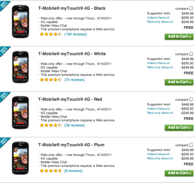 Today’s deal alert is courtesy of T-Mobile.com which has the myTouch 4G in all four color variants available for FREE to any new or add a line customer. It appears those looking to upgrade will still pay the $199.99 after MIR price. Anyone with an eye on the myTouch 4G should definitely take advantage of this deal right away as it likely won’t last for long!