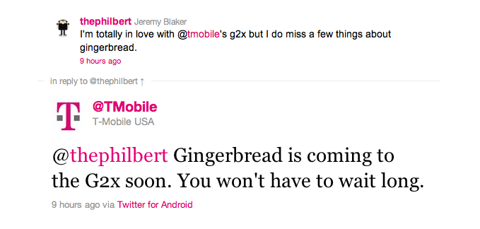 T-Mobile certainly dropped an Easter egg (no pun intended to those who celebrate today) when asked by a new G2X owner on Twitter regarding Gingerbread. As you can see in the above pic, T-Mobile stated Gingerbread will be coming “soon” and that you “won’t have to wait long.” Big words from the company and we hope that they and LG are prepared to make it happen “soon.” Of course, nobody knows what the T-Mobile definition of “soon” is but knowing as they do that someone would catch this tweet and spread it around, I’m hoping they are ready to impress us with a timetable.