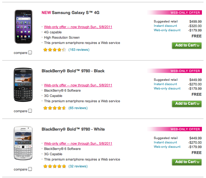 If the myTouch 4G sale through T-Mobile.com earlier this week didn’t grab your attention, perhaps the Samsung Galaxy S 4G or Blackberry 9780 will. The very same deal applies requiring the opening a new line of service or adding a line to an existing account with a two year contract to qualify. This offer is only good through T-Mobile.com and lasts through Sunday May 8th.