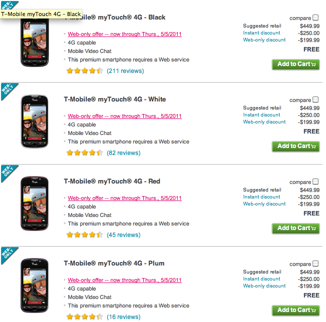 Attention deal hunters, T-Mobile is offering a web only special on the myTouch 4G in all colors free for new and add a line customers through Thursday, May 5th. With Gingerbread on the horizon the myTouch 4G isn’t ready to give up its place in the T-Mobile lineup. Act fast before this deal disappears!