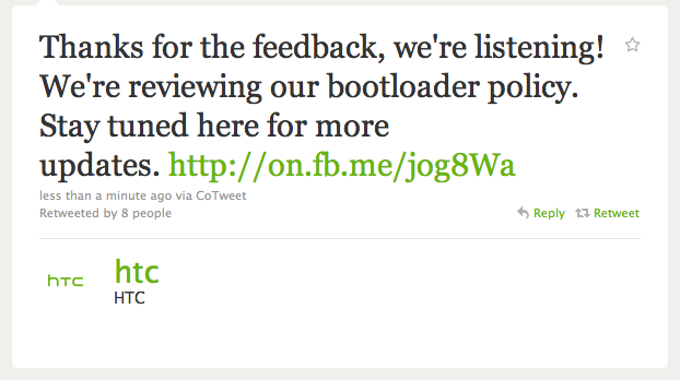 HTC put forth their message on Facebook and Twitter. Their Facebook comment was a little longer than Twitter thanks to the lack of character limits: