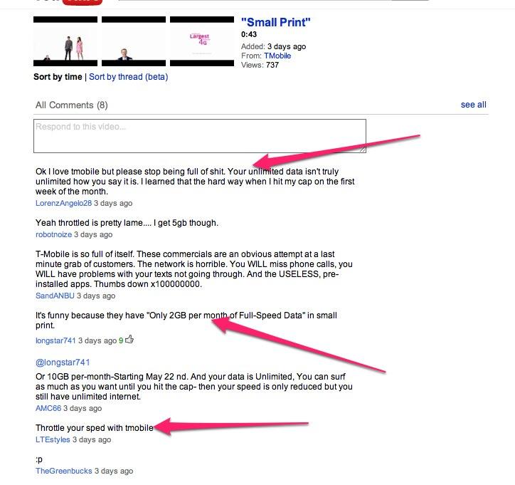 In a blog post that appeared early in the morning the day this YouTube/Twitter debate went down, we posted a breakdown of T-Mobile’s new data plans which included the difference between “high speed” and “reduced speed”. An email sent while using high speed takes 2-6 seconds and reduced speed, or throttling, takes 30-40 seconds. That’s a very noticeable change and one that completely affects the user experience. I can’t imagine users who are used to sending dozens of emails per day using reduced speed for actual work. It’s just not feasible. T-Mobile is misleading its customers with commercials like the one that would have aired. I’m evidently not alone in my thoughts as the few comments that were made about  the YouTube video before it was taken down show other individuals were ready to call T-Mobile on the hypocrisy in its advertisement.