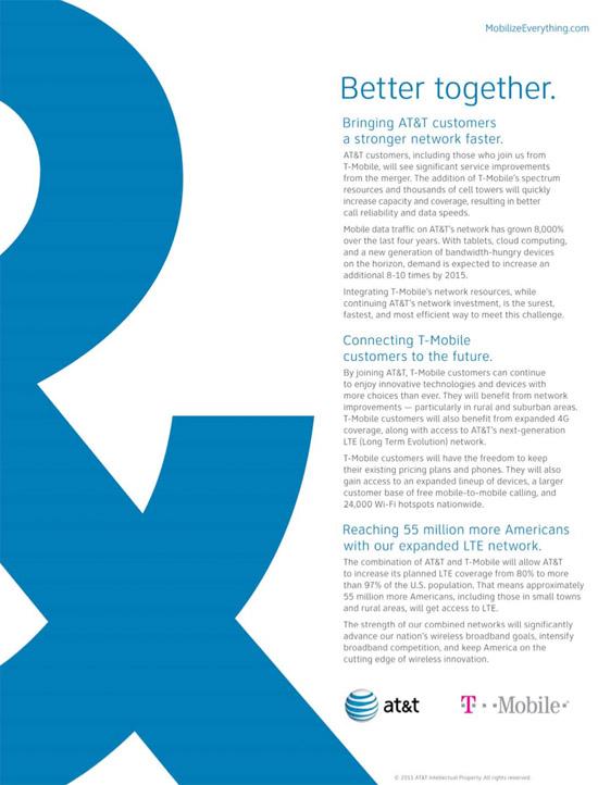 On the flipside is AT&T who responded with a separate newspaper ad that touted the benefits of a combined deal for T-Mobile customers and current AT&T customers alike. Offering up the same message since the very beginning AT&T emphasizes “significant improvements from the merger.” Yup, pretty much the same message we’ve heard from AT&T time and time again, service will improve, cats and dogs will be as one and the world be a bright and shiny place. Of course in their public interest filing with the FCC AT&T also said that the world would be a dark and scary place (those are my words summing up my impression of their filing by the way) if this deal doesn’t proceed.