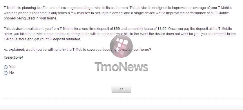 As it turns out a recent survey conducted by a third party on behalf of T-Mobile was sent our way and as you can see in the above picture a question was asked regarding an in home coverage solution. While we have total love for the Wi-Fi solution T-Mobile has established in partnership with Kineto we know that not all folks have the option for Wi-Fi calling. It’s a stretch to say that a survey is a definite indicator of a service actually making it to the general customer base but it at least shows T-Mobile is considering their options. At $50 a unit and $1.99 a month I can imagine this would be a huge hit with T-Mobile customers as it’s an inexpensive solution to often frustrating problem.
