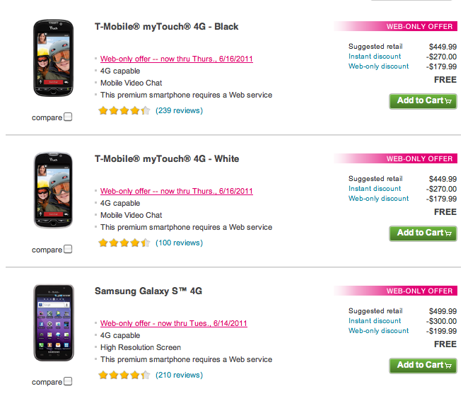 T-Mobile.com is back again with yet another web-only special running through Tuesday or Thursday depending on your phone selection. If you’re looking to grab something through Tuesday the Samsung Galaxy S 4G is free for new activation or add a lines! If you want to go for the myTouch 4G the very same deal applies but you have until Thursday June 16th to act. Both of these deals are only good for new customers or add a line activations so take note! Will you go for one of these or wait for something new?