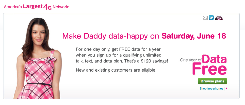 BELLEVUE, Wash. — June 14, 2011 — In honor of Father’s Day,T-Mobile USA, Inc. is celebrating, once again, with a compelling offer that will reward customers all year long. On Saturday, June 18, for one day only, customers who sign up for a new qualifying talk, text and data plan will get 12 months of free data. That means customers will be worry free when surfing the mobile Web, staying in touch with friends via social networking, or checking their email. And, with a growing portfolio of affordable 4G smartphones to choose from, families can find the perfect gift for dad — or themselves — this Father’s Day while saving money and staying connected on America’s Largest 4G Network™.