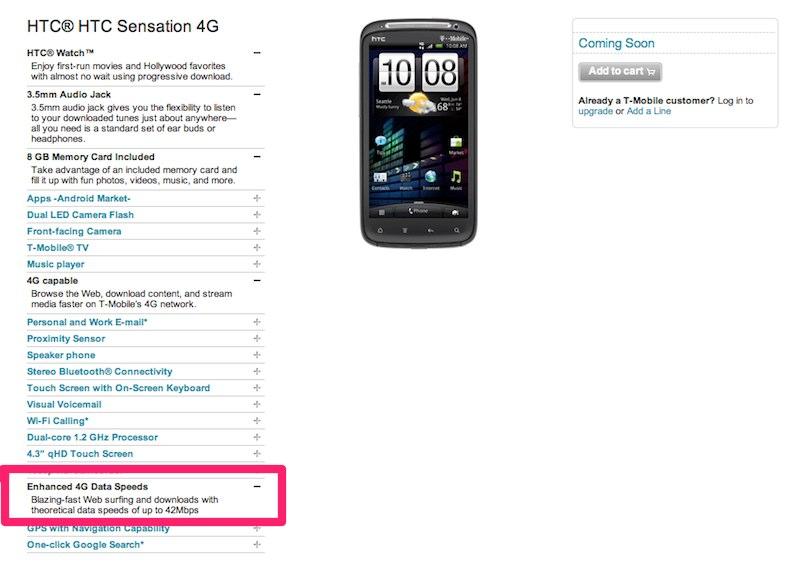 It’s unfortunate when website hiccups like this occur as future Sensation 4G owners are possibly led to believe that the phone will support these kinds of speeds. The reality is the Sensation 4G, like all good HTC phones in the US running on the T-Mobile network, has the standard HSPA+ radio that supports 14.4Mbps speeds. The HTC product page for the Sensation 4G confirms the 14.4Mbps download speed max so we’ll just chalk up this T-Mobile.com error as a misprint.