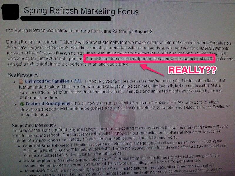 T-Mobile wants to come on strong this Spring with a marketing focus that emphasizes their industry leading value and featured smartphones such as the Samsung Exhibit 4G. Wait what? The Samsung Exhibit 4G? That’s the phone that is going to be emphasized for Spring marketing? Who on earth is running this show anymore? Didn’t I just write about this?
