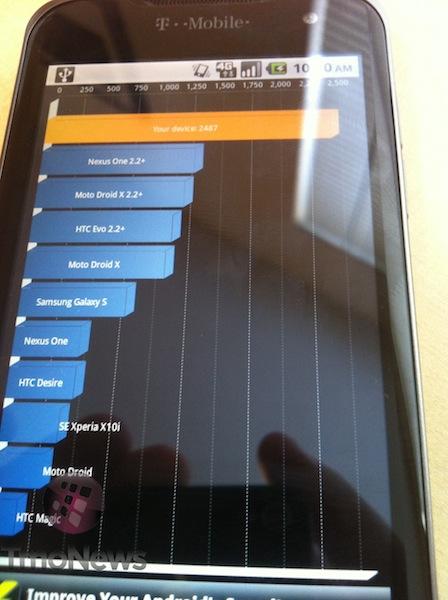 The G2x really showed its power on the Quadrant tests with scores that were averaging right around the 2400 range, easily besting the Nexus S and DROID X by over a 1000