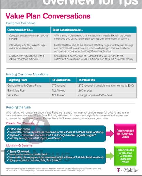 We can’t get enough of the new Classic/Value plan rollout information so we’re back with some more intel and price comparisons pitting T-Mobile against the competition. We’ve already seen a little bit of this in a post last week but this time it’s in color! T-Mobile continues to emphasize employee training by focusing on the benefits of each plan over the other in order to offer the customer the best possible solution and we can get on board with that. While we may not love the idea of a subsidy-less environment we can dig lower pricing. For some the Value Plan may entice them as they see a lack of data requirements being a standout reason to jump on board with the Value plans.