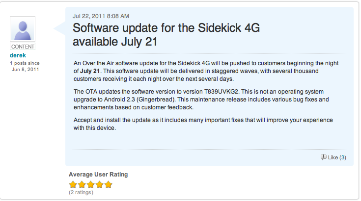 T-Mobile Sidekick 4G owners have been waking up for the past few days to an alert to a software maintenance update that fixes bugs. The update began going out sometime overnight on July 21st and will be delivered in waves over the next few days. This is NOT an Android update to Gingerbread sadly but a maintenance update which will squash some bugs and provide enhancements based on customer feedback. You should accept this update because T-Mobile says it will “improve your experience with the device.”