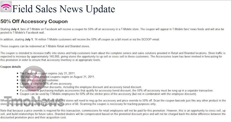 Good news T-Mobile fans if you’ve been holding off on your accessory purchases as T-Mobile is set to provide customers with 50% coupons beginning today, July 1st through your SCOOP email. If you don’t get the monthly T-Mobile SCOOP email not to worry as T-Mobile Facebook fans will have a chance to grab a 50% accessory coupons beginning July 4th. The coupon will appear in your news feed along with a post on T-Mobile’s Facebook wall. The coupons can be redeemed at your local T-Mobile corporate owned store.