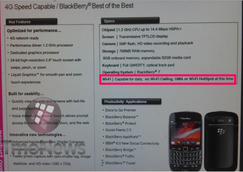 What’s truly interesting about the second image we received is listed under the specs: no Wi-Fi calling, UMA or Wi-Fi Hotspot. The image expressly tells us that these particular features are a no go at this time. However, according to the folks at MobileSyrup a leaked document for Canadian carrier Rogers indicates the UMA feature will “not be available at launch — enabled via software update at future timeframe.” We’ll assume that the means the update is coming from RIM and that it will be a worldwide update to Blackberry Bold 9900 users. Without this feature at launch we wonder if Blackberry isn’t risking some immediate sales on T-Mobile or other UMA supporting carriers if the 9900 lacks UMA.