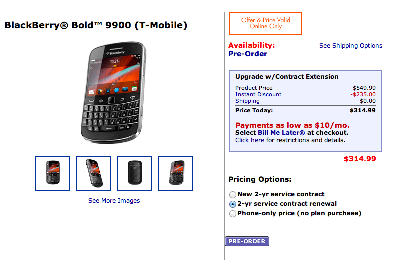 If you’re looking for a less expensive alternative to buying from T-Mobile directly, Blackberry Bold 9900 buyers should take a peak at Walmart’s pricing. New customer activations get a STEEP discount with a low price of just $119.99 on a two year contract. Things aren’t as good on the two year upgrade front with a discounted price of $314.99 making T-Mobile’s already ridiculous $299.99 after $50 mail in rebate pricing look better. Still, for those looking to grab a Blackberry on a new line this is a deal you likely won’t be able to pass up given the significant price difference.