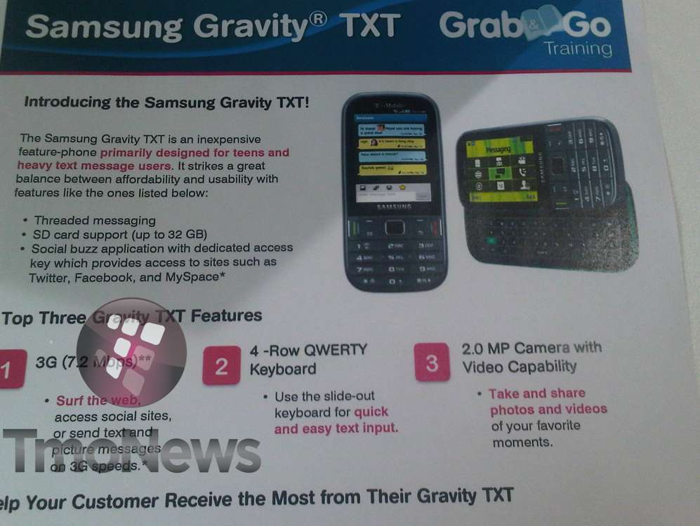 “The Samsung Gravity TXT is an inexpensive feature-phone primarily designed for teens and heavy text message users. It strikes a great balance between affordability and usability with features like the ones listed below.”