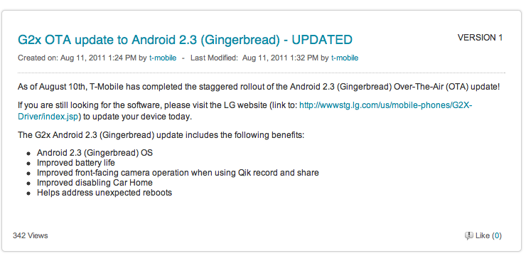 T-Mobile has announced via their support forums that the T-Mobile G2x OTA Gingerbread update has officially ended as of August 10th. Anyone still looking for the update will be able to perform a manual upgrade using the LG updater found on the LG website.