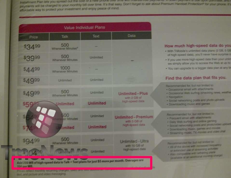 T-Mobile has confirmed in a short statement to the Wall Street Journal their intent to change the low-end data plan to incur overage charges rather than throttling customers who hit the limit. “Customers will incur overages of $0.10 per MB when they exceed 200MB of data ($10 for 10MB) up to a maximum monthly payment of $40 with Value plans or $45 with Classic plans for data including the 200 MB add-on fee.” This represents a small change since our own leaked info stated that the overage charges would be maxed out at $30 for Classic Plans and $35 for Value Plans.