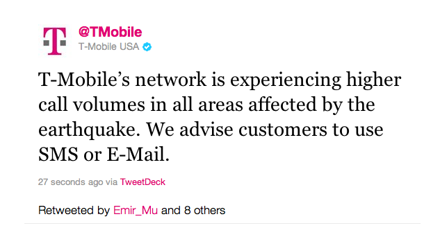 In case you are just catching the news a 5.9 magnitude earthquake outside of Washington D.C. and up along the east coast is affecting T-Mobile service. The above tweet shows that T-Mobile is aware of the difficulty as are all major operators experiencing trouble and customers are advised to use SMS or e-mail in the meantime. Hope everyone is safe!