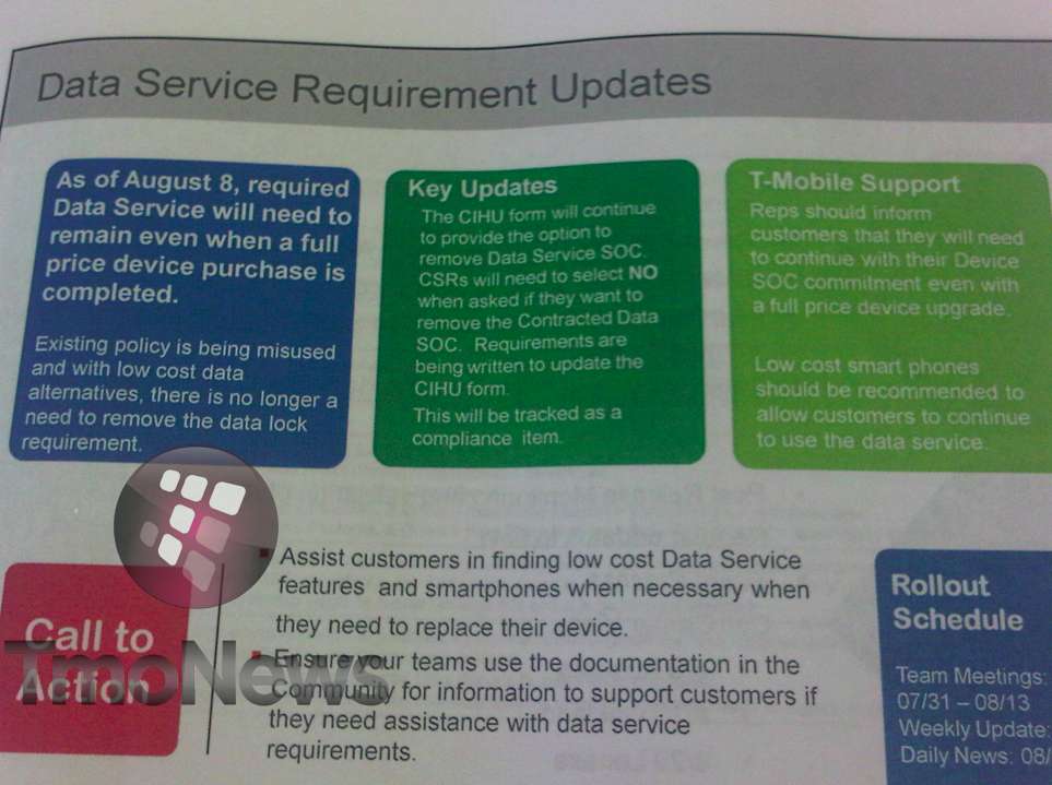 As of August 8th T-Mobile is making a change to ensure that customers fulfill their contractually obligated data requirements. T-Mobile is looking to ensure that customers fulfill any contractually required data plan. The current loophole that allows for employees to remove the data plan before the end of the data plan contract term will be removed effective August 8th. This will not enforce a data plan for all full price buyers, only the completion of any contractually required data plan.