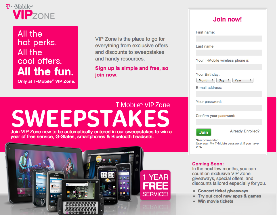 com to your address book. Fill out the form below to let us know you didn’t receive your winning email.Q5. How will I know if I’m the sweepstakes winner?A5. The grand prize drawing will be held after the promotion ends on or around 10/17/11. The winner will be notified via the contact information provided upon registration.Q6. I got a message that I’ve already entered today, but I haven’t. What should I do?A6. First, make sure you are visiting T-mobile VIP Zone Sweepstakes directly rather than a bookmarked page in your browser. You may also need to clear your Temporary Internet Files. Just click ‘Tools’ on the menu bar at the top of your browser and selecting ‘Internet Options’ from the drop down menu. Choose the ‘Delete Files’ button and delete all of your Temporary Internet Files. This should help.Q7. I think I’m having technical issues. What should I do?A7. Sometimes it’s a simple thing like updating your browser. Check to be sure that you have a modern version of Internet Explorer, Firefox, or Safari. Also, you may want to be sure you have the latest Flash player (it’s free!) and check your browser preferences section to be sure Javascript is enabled.Q8. Once I register for the sweepstakes, how will my information be used?A8.Your information is primarily used to contact you if you’re a winner, and if you sign up to receive emails from us. See our Privacy Policy for complete details.Q9. I have recently moved or updated my email address. Can I change my registration information for this promotion?A9. We apologize for any inconvenience, but due to the number of entries we receive, we are unable to change registration information unless you are awarded a prize. If you do win a prize during the promotional period, please contact fulfillment@eprizefulfillment.com and provide your updated information.Q10. Why can’t I use my P.O. Box address on the registration form?A10. Our shipping service cannot ship any prizes to a P.O. Box, so if you’re identified as a winner, we’d need to send the prize to your home. Also, your home address allows us to identify your residence for eligibility purposes.