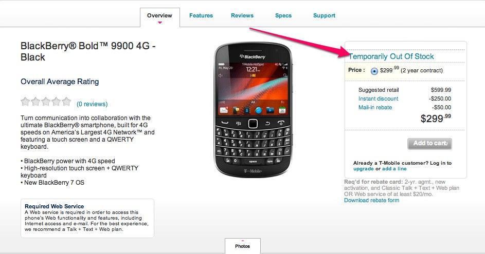 Well that took no time at all as the Blackberry Bold 9900 is already listed as “Out-of-Stock” on T-Mobile.com less than 24 hours after the phone launched. We anticipated that Blackberry users on the Magenta network would eagerly scoop the Bold 9900 up but we didn’t expect it to sell out within one day. Congratulations RIM, you’ve still got an audience after all.
