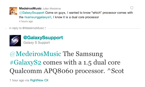 It appears as though Samsung’s very own @GalaxySsupport Twitter account has let loose the processor that we will eventually find inside the T-Mobile bound Galaxy S II. PhoneDog reader @MedeirosMusic pinged the Samsung Galaxy S Twitter account about the processor only to be told it was a dual-core option. Well that answer didn’t suffice as Julian further pressed the Samsung account for an actual processor and got an answer: a 1.5GHz dual-core Qualcomm APQ8060 processor or exactly what people expected would be inside the phone.