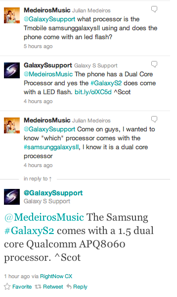 It appears as though Samsung’s very own @GalaxySsupport Twitter account has let loose the processor that we will eventually find inside the T-Mobile bound Galaxy S II. PhoneDog reader @MedeirosMusic pinged the Samsung Galaxy S Twitter account about the processor only to be told it was a dual-core option. Well that answer didn’t suffice as Julian further pressed the Samsung account for an actual processor and got an answer: a 1.5GHz dual-core Qualcomm APQ8060 processor or exactly what people expected would be inside the phone.