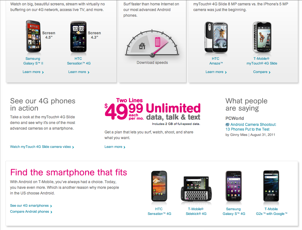 We should back up for a minute and say this isn’t as much of a hint as it is a mistake. One thing is for certain, the device pictured on the Android page of T-Mobile.com is most definitely NOT the HTC Sensation 4G. In fact, judging by the three capacitive buttons we see at the bottom of the handset it absolutely reminds us those leaked shots of the myTouch by LG device that surfaced during the middle of September. The placement of the myTouch branding combined with the three capacitive buttons and we’re sure that yet another shot of the future myTouch by LG device has leaked on T-Mobile’s website.