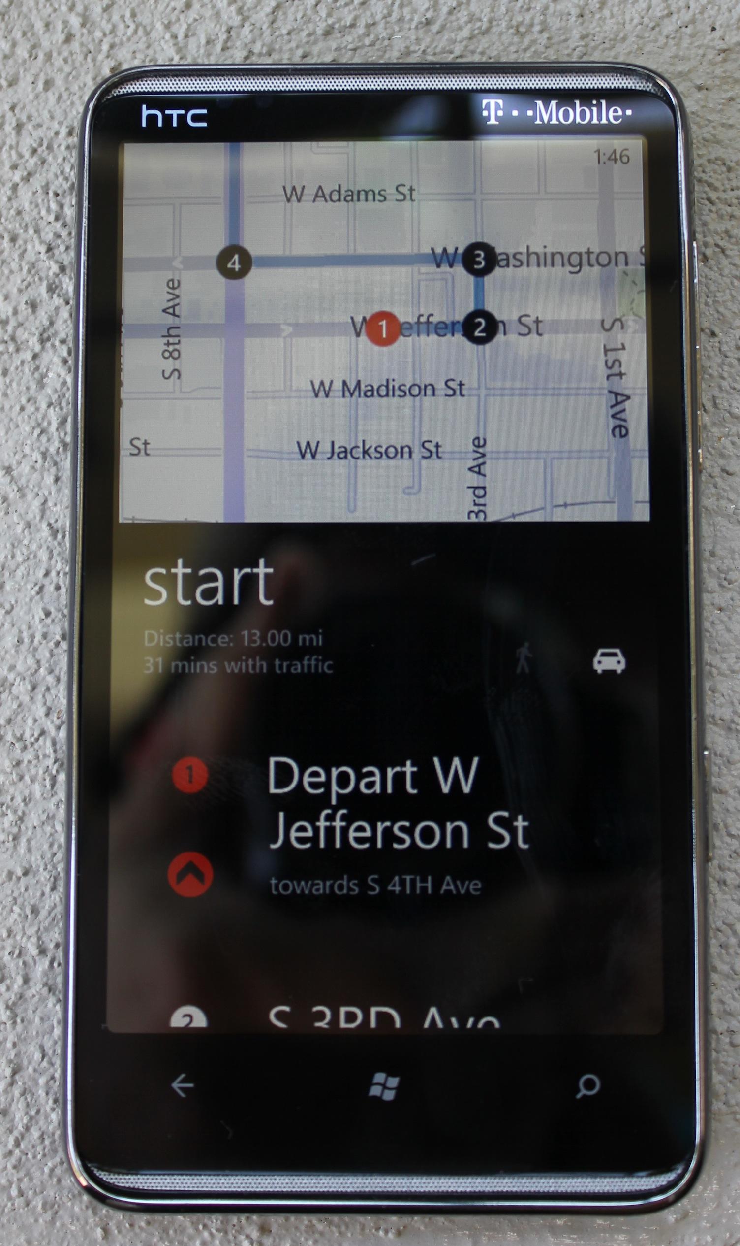With that, you also have Turn-By-Turn Navigation, sort of. Now, it is turn-by-turn, but I feel like it misses the mark here. This phone picked up my location very accurately (scarily so), and was able to provide the correct directions. It also followed my location and moved the map with me as I moved along. These are great improvements, especially over the original map functions. With navigation, though, I expect the inclusion of voice directions as I drive. Instead, Mango forces you to tap the screen to listen to the audible directions. Now, it will give you a nice like “ding” notification when you move to the next step to remind you to look at it. Are we seeing the problem here? I thought we were trying to distract ourselves less while driving? I don’t want to look at my phone for directions and I especially don’t want other people looking at their phones for directions. I want, and I expect, voice directions, especially when Google did it so nicely.