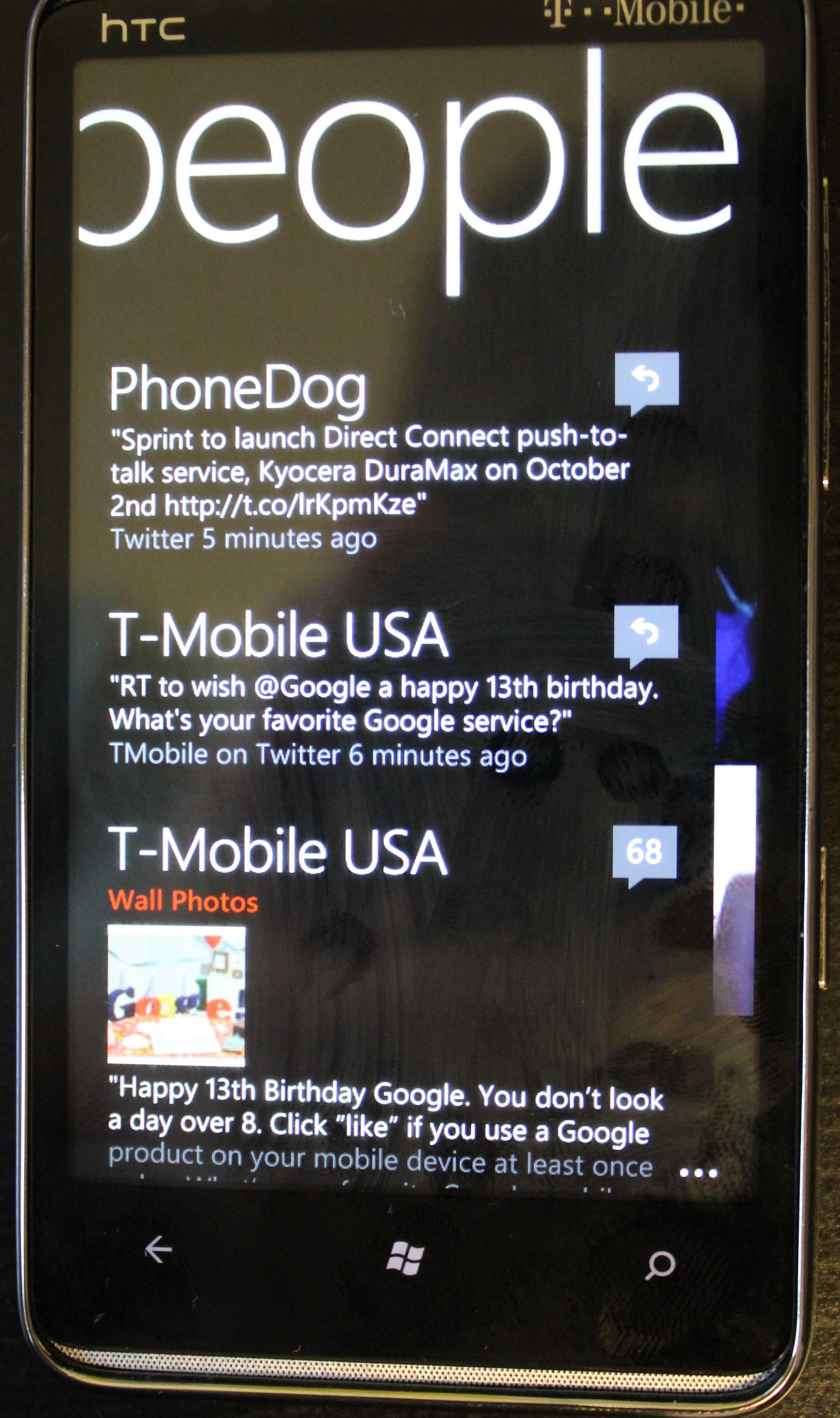 Facebook for WP7, even if it is still missing some features (which are kind of solved by Facebook integration – next paragraph), is much cleaner and much more reliable than its Android counterpart. Twitter is too, but it still doesn’t save my most recently read position or really give me new update notifications (I think Tweetdeck, or erm Twitter, owes me some money for pushing how much I love their Android app in a WP7 Mango review). Using these dedicated apps cleans it up for me, and makes it much easier to check specific updates, plus multiple twitter account supports, so there is that.