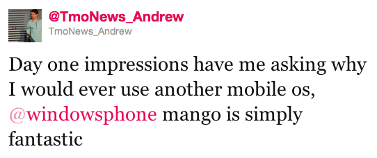 So why do I praise Mango over the rest, and why do I think you should give it a try? Easy, because I simply enjoy using it (yes, that is entirely opinionated). It is simple and elegant, quick and functional. It does everything I need it to do, and it does it well. Other phones, with their flashing LED notifications, want me to make time for them. Windows Phone 7, and Mango specifically, allows you to check your phone on your time. Your life, simplified.