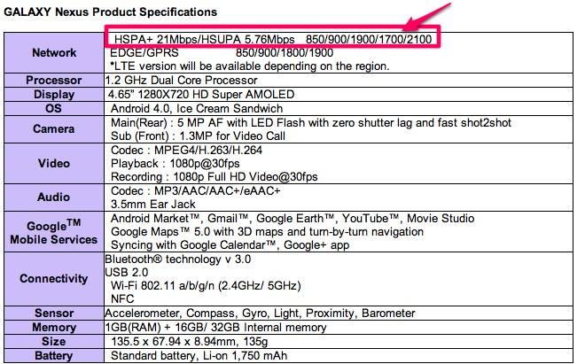 After you take care of the registration direct your attention below to the two minute promo video and a highlight of the Nexus/Ice Cream Sandwich debut. Please ignore the 21 second mark with Verizon Wireless, we already knew that was going to be a guarantee. As you can see by our spec sheet below we’ve highlighted the penta-band support with clear T-Mobile AWS capability. So, we’re not giving up any hope of a T-Mobile supported variant.