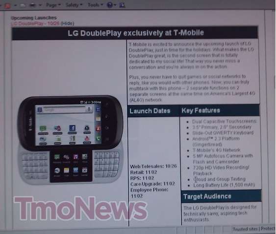 The DoublePlay packs a 3.5″ primary screen, 2.0″ secondary screen with a Slide-Out QWERTY keyboard, Android 2.3, 4G, 5 megapixel camera, 720p HD video and 1500mAh battery. Look for it November 2nd.