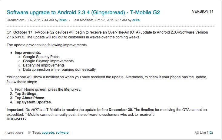 T-Mobile G2 owners should be on the lookout for a small update heading out Over-The-Air to your phones as of October 17th. The update provides a few minor improvements and will rollout over the next few weeks: