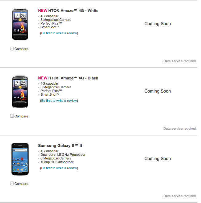 T-Mobile has the HTC Amaze 4G and Samsung Galaxy S II up on their website as coming soon. Of course these have been up for a while but quite a few of you are sending this in so we thought we’d just make everyone aware. Of course we know by “coming soon” they mean pre-order on October 10th but this serves as another reminder that your piggy banks should be ready to crack open in four days.