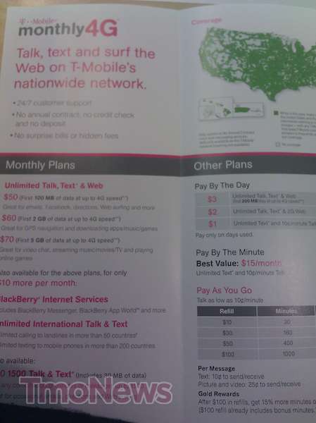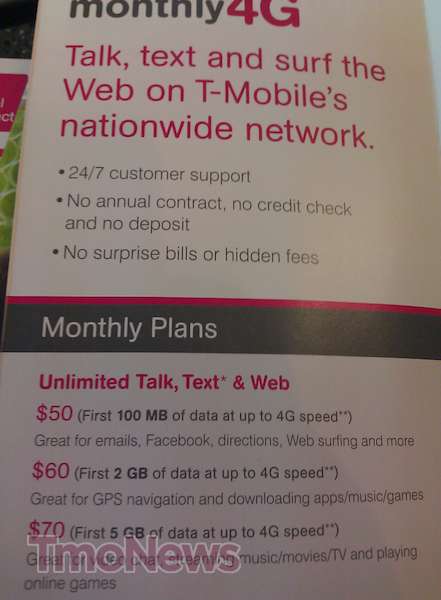 With just a few more days till October 16th and T-mobile’s planned Monthly4G revamp, T-Mobile retail stores are beginning to receive brochures for display. Sunday also marks the introduction of T-Mobile’s joint effort with Wal-Mart to introduce a $30 Monthly4G rate plan offering unlimited text and web as well 100 voice minutes. T-Mobile retail brochures as pictured above make no mention of the special offer from Wal-Mart that can only be purchased off T-Mobile.com.