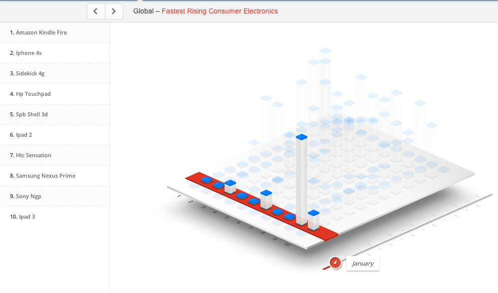 The Sidekick 4G peaked in April when it was the most searched item on this list and really carried itself well throughout the end of the year. The HTC Sensation peaked in July when it took home the most searched for item on this list and also carried itself well throughout the rest of the year.