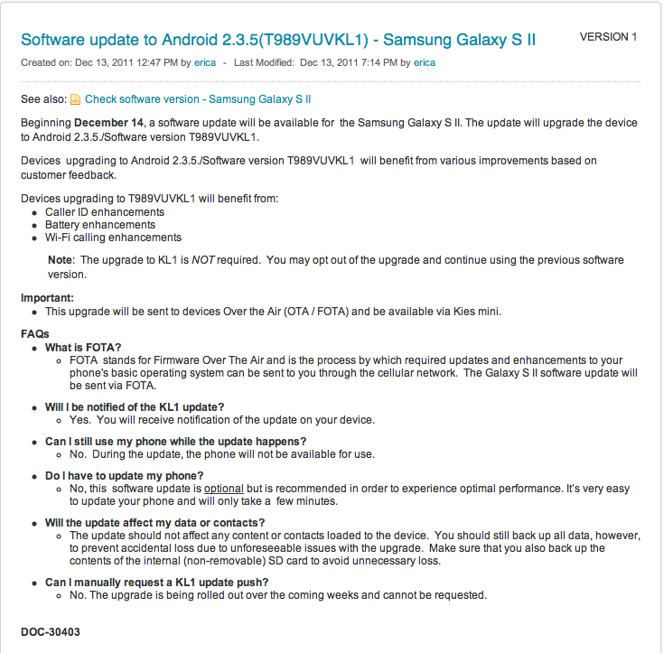 Galaxy S II devices will be upgraded to Android 2.3.5, software version T989VUVKL1 that includes the following enhancements: